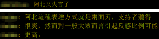 此事在島內網絡論壇PTT上引起網友的議論,網友留言稱:“阿北(指柯文哲)又失言了。”“阿北這種表達方式就是兩面刃,支持者聽得很爽,然而對一般大眾而言引起反感比例可能更高。”↓