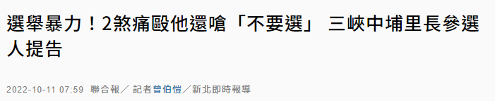 【環球網報道】據台灣《聯合報》11日報道,新北市三峽區中埔里里長候選人翁聖濰,昨天(10日)晚上被2名蒙面男子毆打併被嗆聲“警告你了還出來選!”翁聖濰送醫後沒有大礙。報道稱,翁聖濰今年9月也曾被人恐嚇嗆聲,沒想到昨晚又被人毆打,目前警方正就此事進行調查。