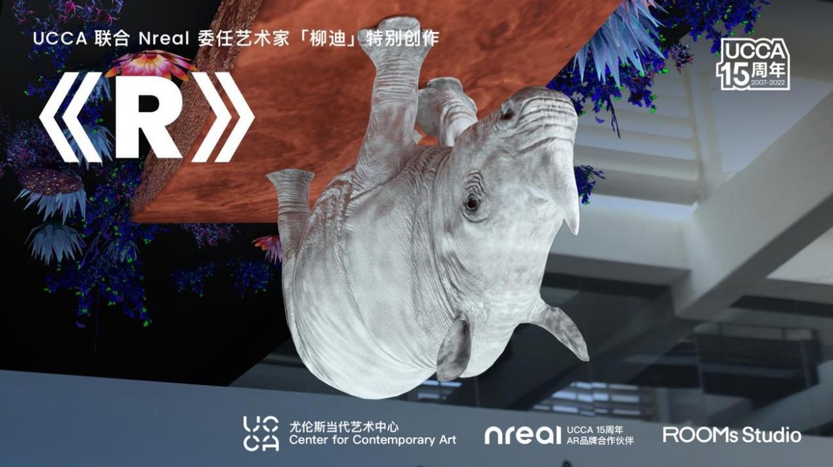 在數字藝術作品《R》中,觀眾們佩戴Nreal X這款AR 眼鏡之後,可以在展區的房樑上看到一隻倒立持續走動的犀牛,但不同於其過去的系列作品中龐然大物般的觀看常理,觀眾們不僅可以走近,或是從不同角度觀看這隻恍若真實存在一般的犀牛,而且通過隔空手勢點擊犀牛,就能獲得藝術家柳迪關於這件作品創作理念的介紹語音,從視覺、聽覺兩方面沉浸式看展。