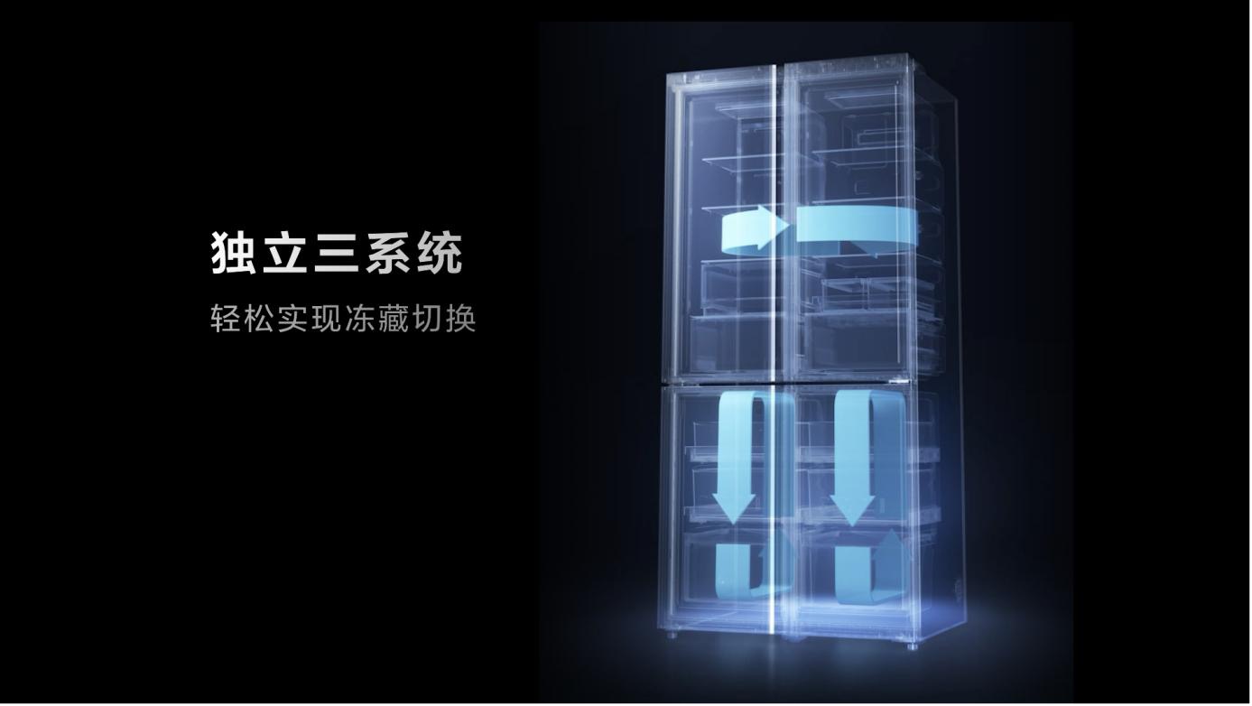 冰箱採用獨立三系統,其配備的三個蒸發器使其擁有寬幅變温功能,底下兩個間室作為寬幅變温空間,能夠實現温度的精準調控。18種不同的自由組合方式,從而也可以作為獨立專屬存儲區使用。如果想讓格物冰箱Q10作為大冷凍大冷藏使用的話,可以通過寬幅變温功能進行温度的變化。