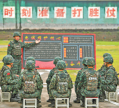 貫徹軍委主席負責制,必須堅持中央軍委集中統一領導,落實請示報告、督促檢查、信息服務工作機制,完善監督問責工作機制。全軍深刻領悟“兩個確立”的決定性意義,全面深入貫徹軍委主席負責制,做到絕對忠誠、絕對純潔、絕對可靠。圖為武警某部聚焦“忠誠維護核心、矢志奮鬥強軍”深化主題教育中開展宣講活動。