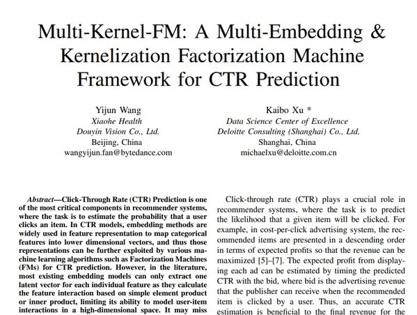 德勤中國此次被收錄的論文名為《多核因子分解機算法:一種應用於CTR預估領域的多重嵌入與核化的因子分解機框架(Multi-Kernel-FM: A Multi-Embedding & Kernelization Factorization Machine Framework for CTR Prediction)》,由德勤管理諮詢中國數據科學卓越中心合夥人徐凱波與字節跳動抖音算法團隊聯合撰寫。德勤管理諮詢中國數據科學卓越中心成立於2020年,專注於數據科學技術在各個企業場景下的研發和應用。