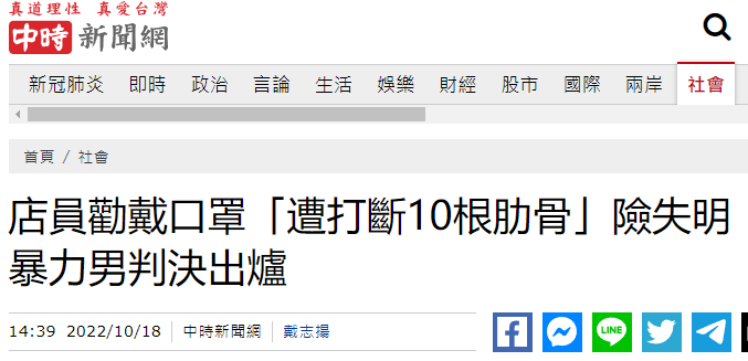 台超市店員勸顧客戴口罩被打斷10根肋骨,施暴者獲刑2年10個月