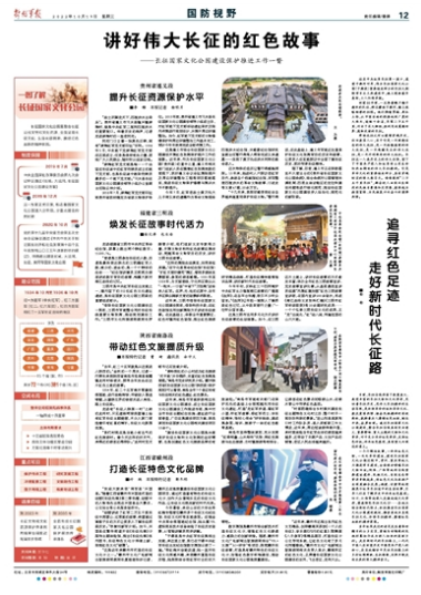 一個個鮮活故事,一件件紅色文物,一處處革命遺址,建設長征國家文化公園過程中,貴州、重慶等地大力推進項目建設,全面保護修繕長征文物舊址;陝西、廣西等地將沿線重要遺址遺存、民族文化、自然生態等資源串聯起來,將紅色文化與旅遊產業深度融合發展;福建、甘肅等地挖掘展示紅軍長征途中的生動故事,引導人們在瞭解歷史中傳承紅色基因;四川、江西等地深入發掘地域文化資源,塑造特色長征文化IP……各地正結合新時代特點,積極推動長征國家文化公園建設規劃,推動其成為呈現長征文化,弘揚長征精神,賡續紅色血脈的精神家園。