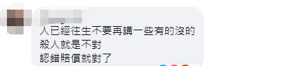 對於這樣的説法,有網友在臉書及台媒評論區留言表示,“人已經往生不要再講一些有的沒的,殺人就是不對,認錯賠償就對了。”“現在講這種話無疑是在傷口上撒鹽。” ↓