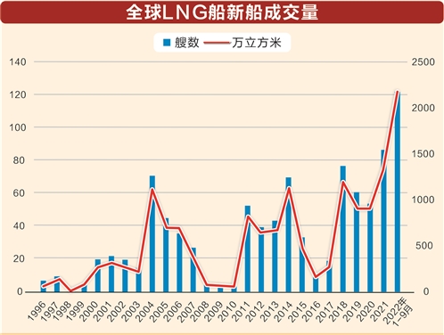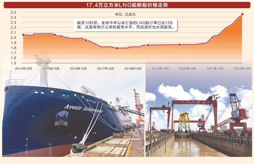 LNG船訂單“一枝獨秀”,造價也水漲船高。據中國船舶集團經濟研究中心方面透露,2022年10月初, LNG船新船價格為2.45億美元,較年初上漲14.5%,創下2014年以來最高水平。