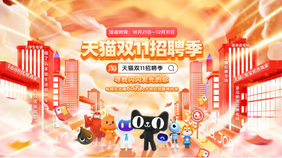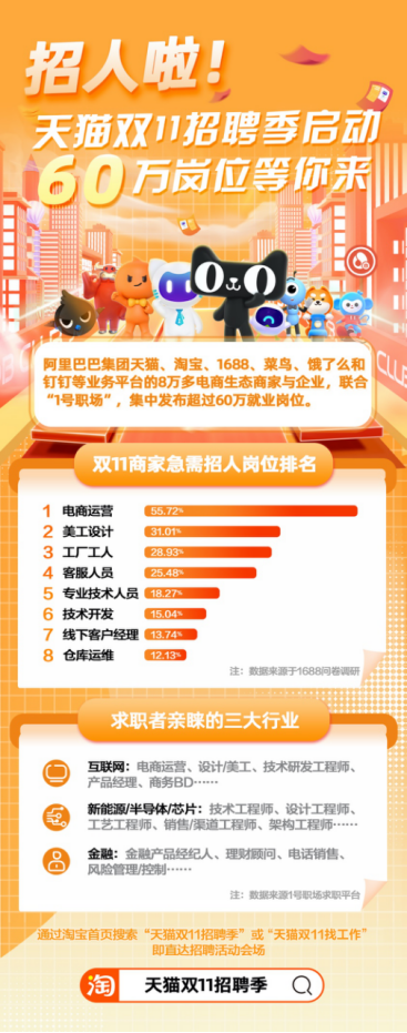 10月21日,“天貓雙11招聘季”活動正式啓動。阿里巴巴聯合第三方招聘平台“1號職場”,發動天貓、淘寶、1688、菜鳥、餓了麼和釘釘等業務平台上的8萬多商家與企業,集中發佈超過60萬的電商崗位人才招募。