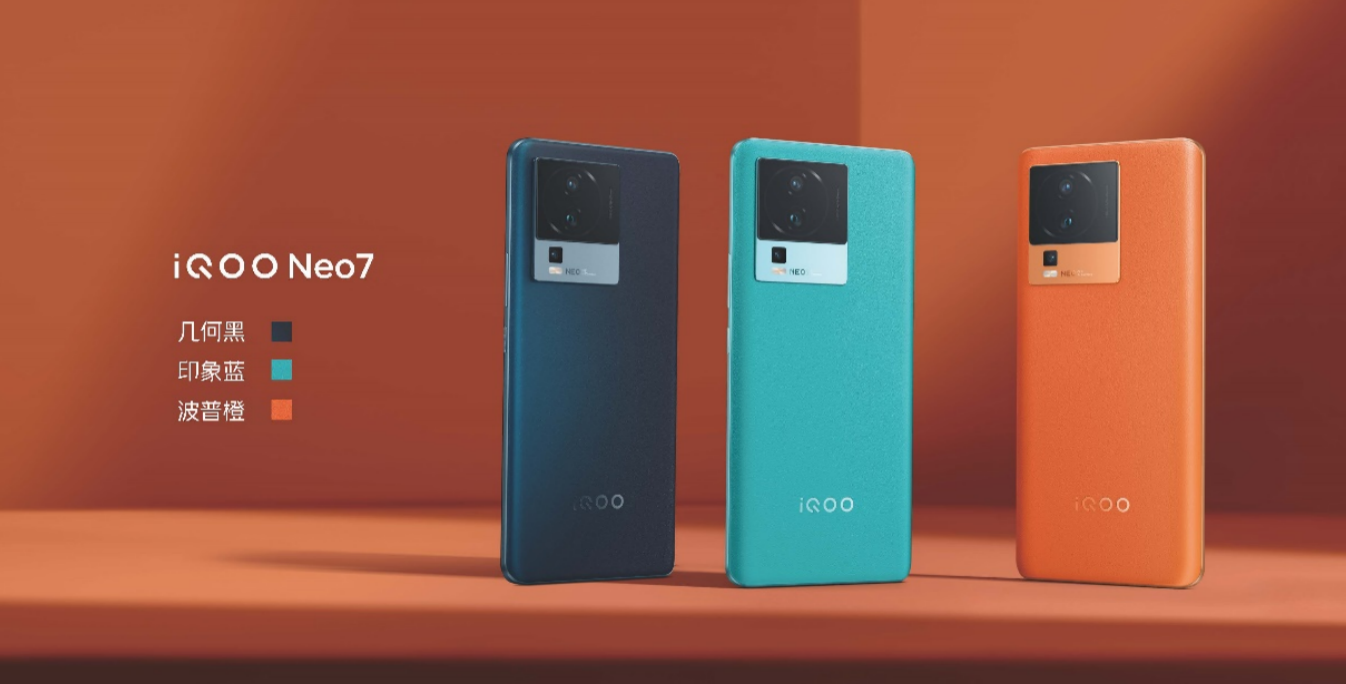 在外觀上,iQOO Neo7擁有幾何黑、印象藍和波普橙三大配色可供選擇,波普橙和印象藍兩款配色產品的後蓋採用了素皮工藝,幾何黑產品則是AG玻璃工藝。