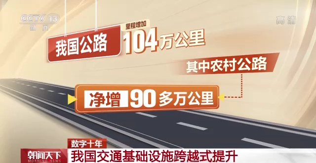 公路、鐵路新增的近2萬座隧道、30多萬座橋樑穿山越海連路成網。如今,每一百平方公里中就有超過55公里的公路。十年來,我國公路里程增加104萬公里,其中農村公路淨增90多萬公里。