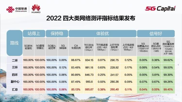 憑藉北京聯通創新的數字化運營模式以及華為5G創新技術,雙方於2022年8月完成了超過3000個站點的200MHz大帶寬網絡部署,實現了北京城市核心區域的全面覆蓋。並於9月底,雙方邀請主流媒體代表最終用户對該200MHz網絡的主要交通幹線、街巷毛細道路進行了四大類“佔得上、保持穩、體驗優、信號好” 十二項指標的全面測評。其中,此次體驗測評引入了CA生效比這一新指標,用於體現200MHz大帶寬的CA的連續性表現。測試結果表明,CA生效比達到了85%,5G用户下行峯值速率達到1.8Gbps,下行平均吞吐率達到885.7Mbps,上行峯值速率達到400Mbps,上行平均吞吐率達到260.4Mbps,信號良好覆蓋率保持在99%以上。優異的指標表現,完全支撐了在高速車載移動場景下移動辦公、移動教育、移動娛樂、以及AR/VR等4項5G典型應用。