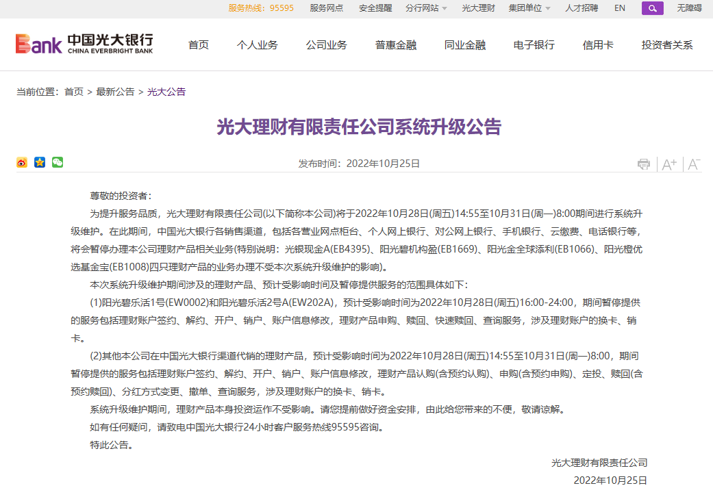 10月25日,光大理財發佈系統升級公告稱,公司將於2022年10月28日(週五)14:55至10月31日(週一)8:00期間進行系統升級維護。在此期間,中國光大銀行各銷售渠道,包括各營業網點櫃枱、個人網上銀行、對公網上銀行、手機銀行、雲繳費、電話銀行等,將會暫停辦理公司理財產品相關業務。