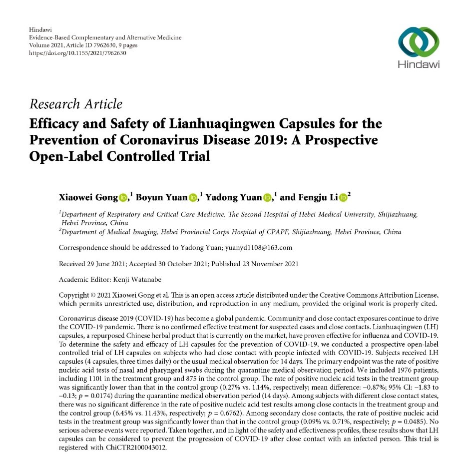 近日,由河北醫科大學第二醫院主持開展的“連花清瘟膠囊預防新型冠狀病毒肺炎”真實世界研究論文被國際學術期刊《循證補充和替代醫學》刊發,首次證明了連花清瘟膠囊對新冠肺炎密切接觸者、次密接觸者的有效性和安全性,密接人羣應用連花清瘟可降低新冠肺炎陽性感染率達76%。
