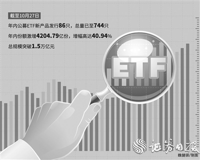 Wind數據顯示,今年以來(截至10月27日),公募ETF呈現出快速發展態勢,新產品發行86只,總量已至744只,年內份額激增4204.79億份,增幅高達40.94%,總規模突破1.5萬億元。