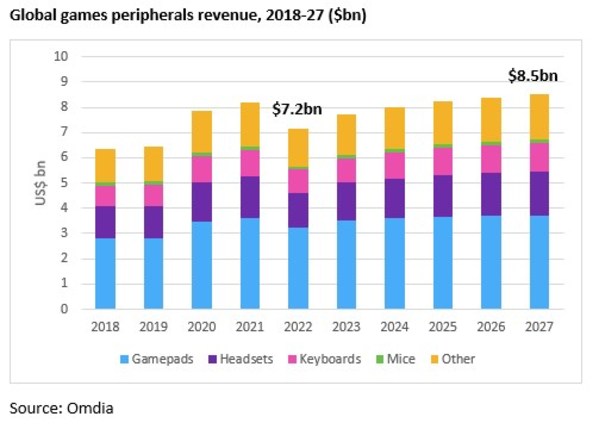 Omdia的第一份《遊戲外圍設備預測》顯示,2027年全球遊戲外圍設備收入將達到85億美元