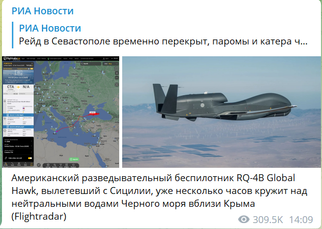 此外,俄新社也報道稱,“Flightradar24”網站的相關信息顯示,美國空軍一架RQ-4B “全球鷹”無人偵察機在克里米亞附近的黑海中立水域上空已“盤旋”數小時,該無人偵察機是從西西里島起飛的。俄新社還一併配上了“Flightradar24”網站關於該無人機的信息圖和一架飛機的圖。