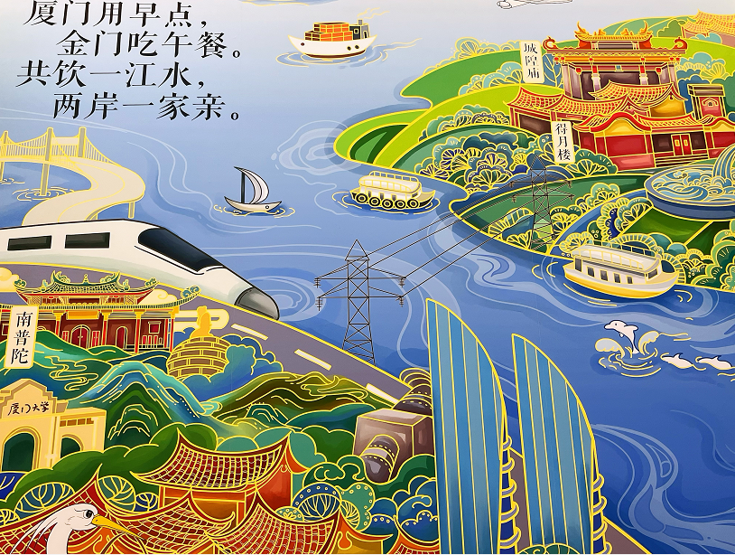 【環球時報-環球網報道 記者郭媛丹】在觀看“奮進新時代”主題成就展後,台灣青年林璟雯29日下午在朋友圈發了一組圖。圖中有一張是在一幅色彩明麗的壁畫前拍攝的,壁畫中廈門金門隔海相望,畫面上有鄭成功像、高鐵、飛機、輪船等等,上方寫着“廈門用早點,金門吃午餐。共飲一江水,兩岸一家親。”