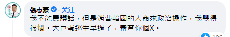 民眾黨籍台北市議員候選人張志豪稱,“我不能罵髒話,但是消費韓國的人命來政治操作,我覺得很爛。”↓