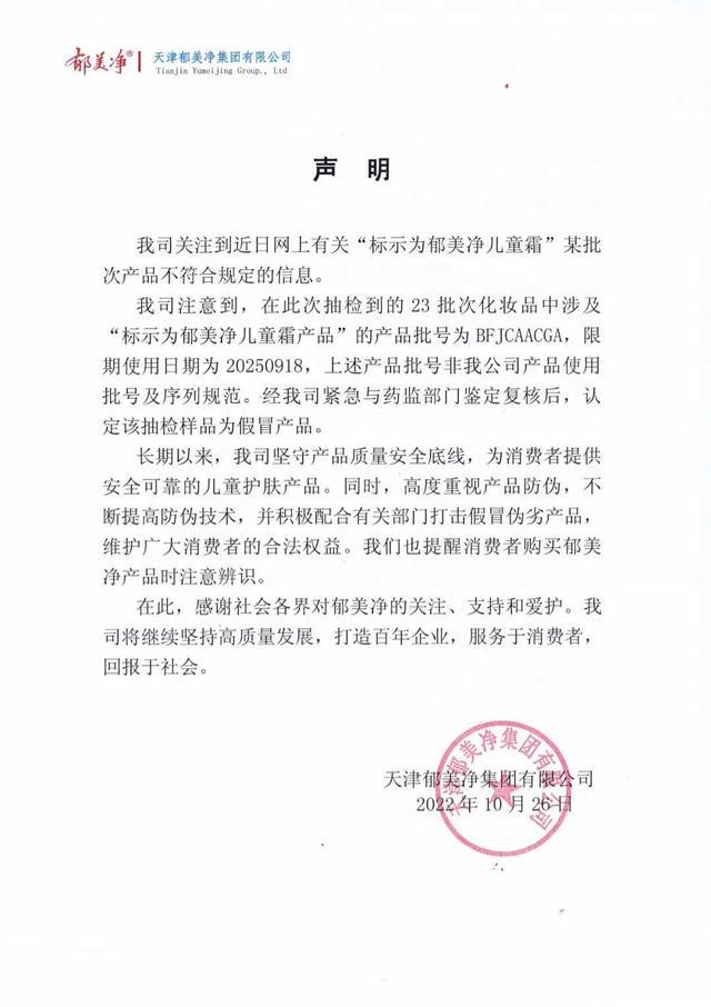 鬱美淨回應“產品不合格”:樣品為假冒產品