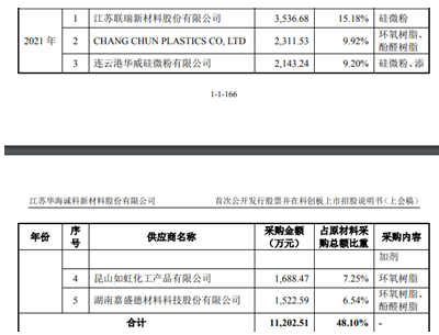 但公司2022年6月13日發佈的招股説明書(申報稿)數據卻顯示,2021年華海誠科對前五大供應商採購額11498萬元,佔原材料總採購額的48.6%,即全年採購23658萬元,比前一版招股書(上會稿)多出370萬元。具體數據如下: