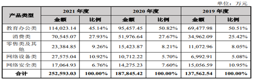 2019-2021年智微智能主營業務收入按產品類別劃分如下: