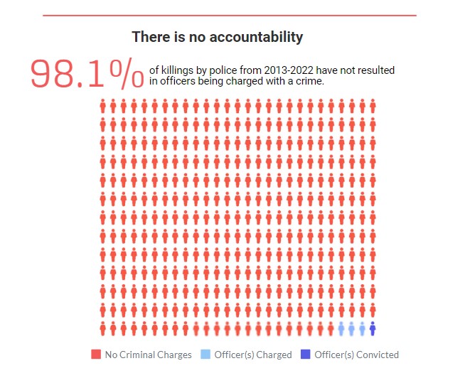 種族歧視、暴力執法的罪惡根植於美國漫長的蓄奴歷史,至今仍在美國社會的毛細血管中流淌,是美國的長期性、系統性問題。根據“警察暴力地圖”網站統計數據,2021年,美國有超過1124人死於警察暴力,其中大部分是在非暴力犯罪甚至沒有犯罪行為的情況下被警察殺害。同時,大多數暴力執法的美國警察都逃過了法律的制裁。“警察暴力地圖”網站調查顯示,2013—2020年期間,有98.3%暴力執法的警察未被指控犯罪。
