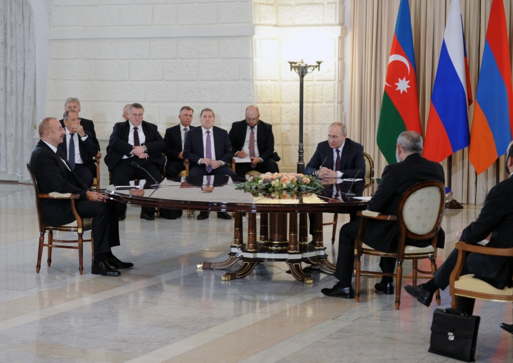 俄羅斯總統普京、阿塞拜疆總統阿利耶夫和亞美尼亞總理帕什尼揚10月31日在俄羅斯南部海濱城市索契舉行三方會談,就納戈爾諾-卡拉巴赫(納卡)問題進行磋商。