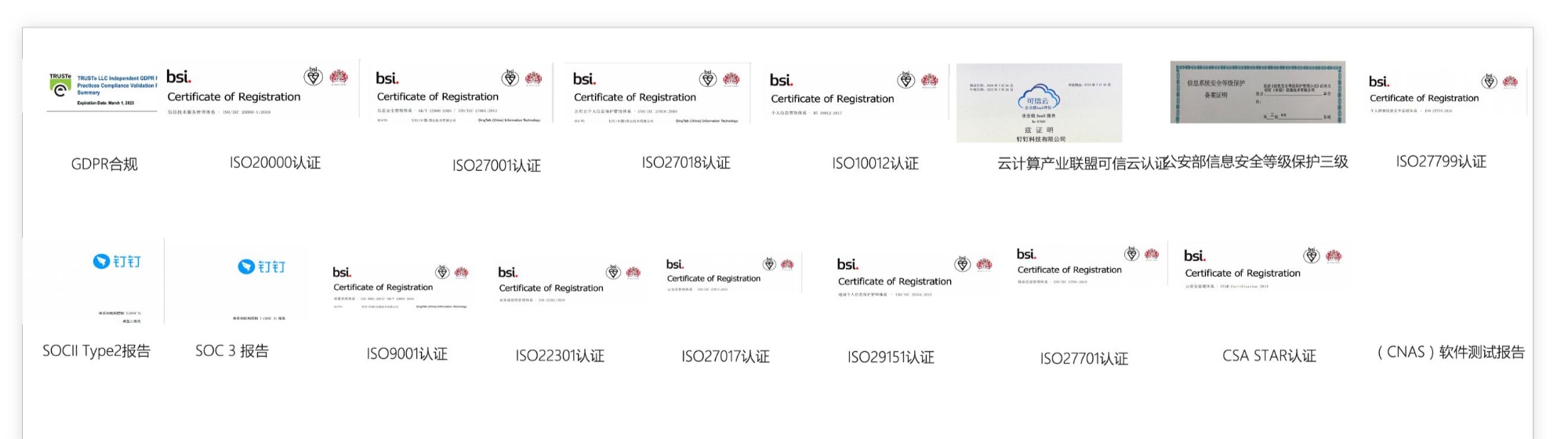 在安全合規方面,釘釘已獲得超過15項權威安全合規資質,是獲得權威合規資質最全的企業辦公協同產品之一,包含國家公安部監督認證的網絡安全等級三級保護認證、ISO 20000信息服務管理體系認證、ISO 27001信息安全管理體系認證, 可信雲企業級saas評估認證等。釘釘還通過了SOC2 TYPE II 和SOC3安全審計報告,該兩項報告由全球知名會計事務所普華永道出具,安全性、保密性以及隱私性為其審計重點。