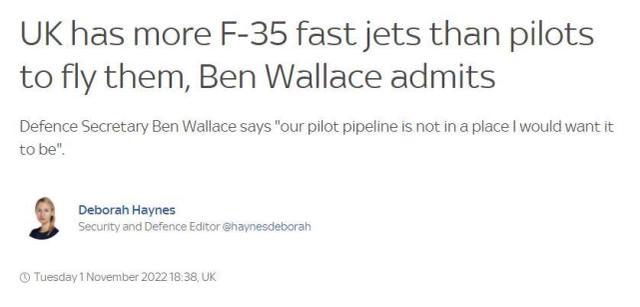 華萊士證實,儘管英國國防部只擁有20多架F-35戰鬥機,但飛行員人數甚至不足以配給所有戰機。英國空軍一名前軍官形容“這一團糟”。