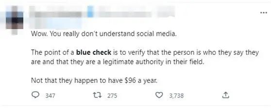 有人認為馬斯克不懂社交媒體,“藍V的作用是認證這個人的身份,證明他們在自己的領域裏有合法的權威——並不是説他們碰巧每年有96美元。”