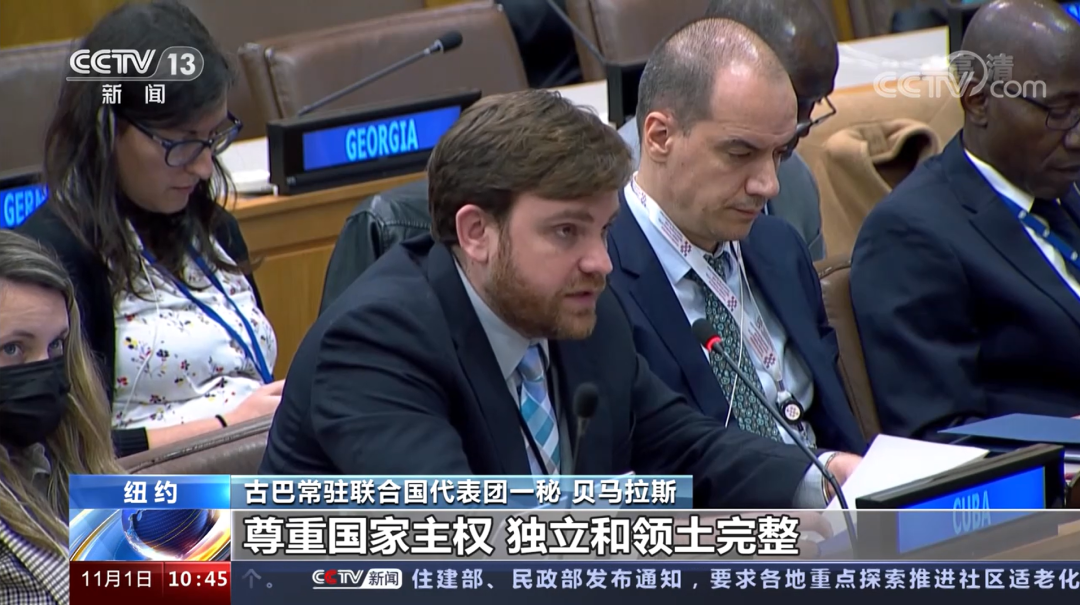 古巴常駐聯合國代表團一秘 貝馬拉斯 :尊重國家主權、獨立和領土完整,不干涉主權國家內政是國際關係的基本準則。新疆、香港、西藏事務是中國內政,我們反對將人權問題政治化,反對雙重標準,反對以人權為藉口干涉中國內政。