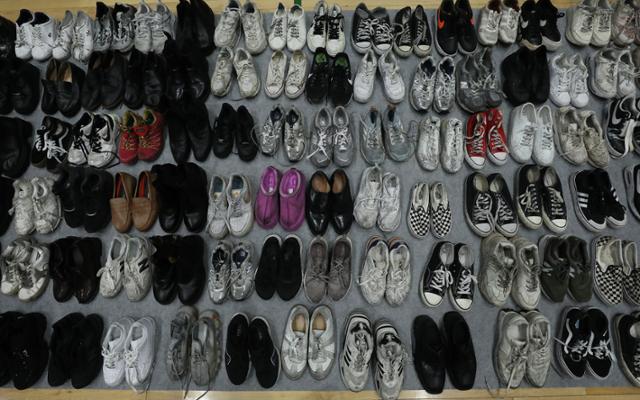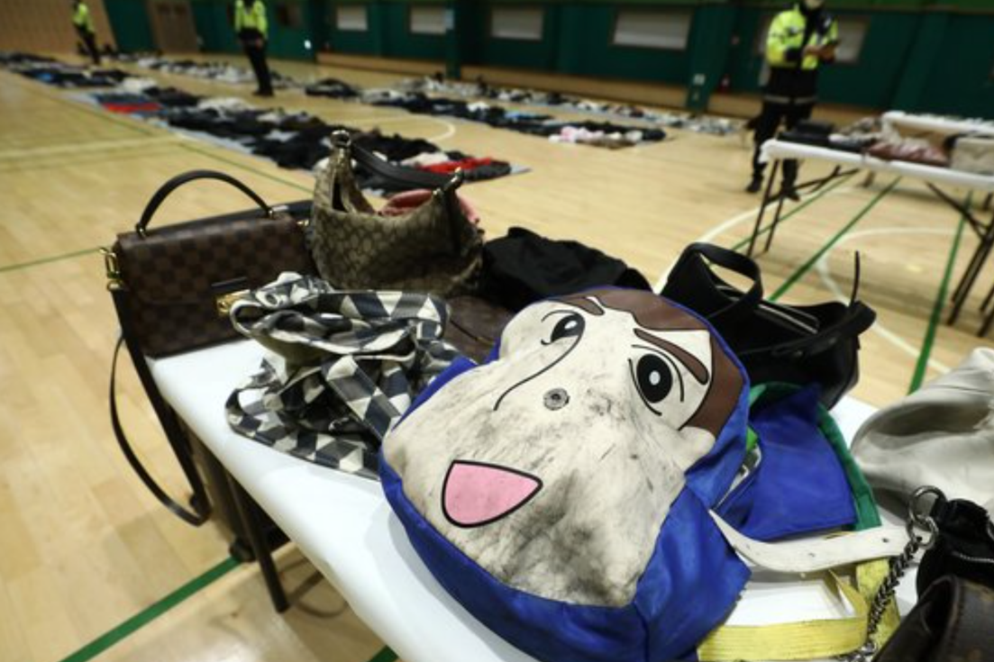 失物招領處設在一家體育館內,場館地面和桌子上擺滿了個人物品,包括124個包、258件衣服、256雙鞋子和156個電子產品等。很多衣服和鞋子上滿是污漬,甚至沾有明顯的血跡。還有皮鞋的鞋跟脱落,有眼鏡鏡腿被折斷、鏡片被踩碎。