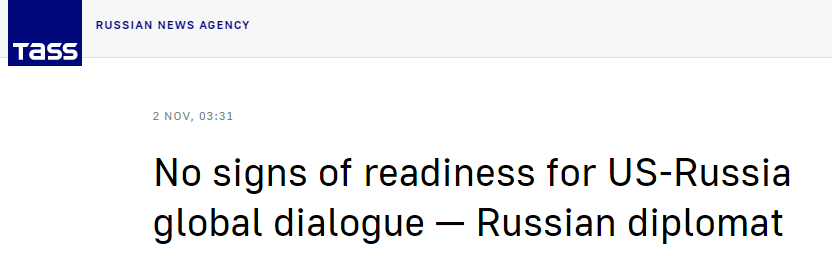 【環球網報道】綜合俄羅斯衞星通訊社、塔斯社11月2日報道,美國白宮國家安全委員會發言人約翰•柯比表示,美國並不尋求與俄羅斯衝突,華盛頓希望通過談判解決烏克蘭問題。據塔斯社報道,俄羅斯常駐聯合國副代表波利揚斯基於當地時間11月1日稱,沒有跡象表明,美國和俄羅斯準備討論國際事務。不過,他強調,俄羅斯“不對任何人關閉大門”。