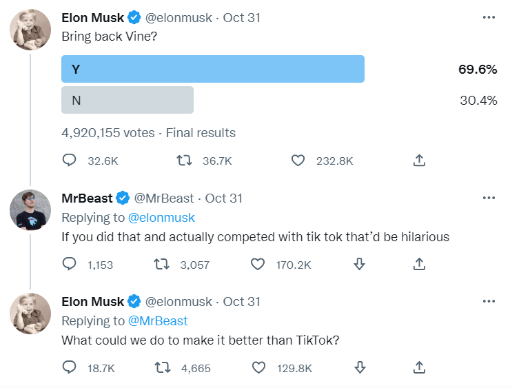 10月31日,推特新任CEO伊隆·馬斯克(Elon Musk)向網友發起民意調查:要不要“復活”短視頻應用Vine?
