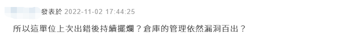 針對此事,有島內網友質疑,“所以這單位上次出錯後持續擺爛?倉庫的管理依然漏洞百出?”