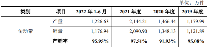 根據招股書披露,浙江豐茂主要產品種類及型號繁多、定製化程度較高,難以直接通過產品數量反映產能利用率;硫化環節是公司生產的主要瓶頸,硫化設備的利用率情況能更為客觀的反映公司主要產品產能情況。2021年浙江豐茂傳動帶硫化設備的實際運行時間為19788天,相比2020年的18012天增幅在10%左右;而與此同時,傳動帶的產量在2021年則為2144.21萬件,同比2020年的1466.44萬件增幅高達近50%,遠超過了傳動帶硫化設備實際運行時間的同比增幅,進而這意味着公司2021年的傳動帶硫化設備生產率,相比2020年高出了20%以上。但是在產品生產流程並未發生改變的背景下,生產率的大體提升合理性值得拷問。