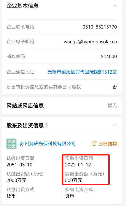公開信息顯示,無錫海博瑞成立於2021年3月,註冊資本為2000萬元,主營業務為光伏電站材料的銷售。但據天眼查查詢顯示,無錫海博瑞在申報的2021年年報中標註的實繳資本僅為500萬元,實繳日期為2022年1月,也即在2021年中這家孫公司仍處於無實繳資本狀態;而且在2021年12月28日之前,無錫海博瑞的投資人為李曉強、惲靖堯兩名自然人,此後才被蘇州潤矽光伏科技有限公司收購成為潤陽股份的孫公司。