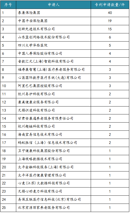 11月2日,IPRdaily中文網發佈“中國企業長期護理保險科技專利排行榜(TOP25)”,泰康保險集團以40件專利申請數量位列第一,領跑全國。根據榜單顯示,上榜企業主要分佈在險企、軟件及信息系統提供商、養老服務機構。