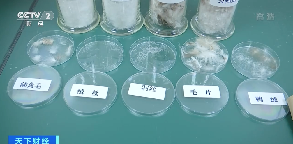 “含絨量”和“絨子含量”的區別在於,以往標準中,含絨量同時囊括了絨子和從絨子或毛片根部脱落下來的單根絨絲兩種含量,而絨絲廢料計入含絨量,容易給消費者造成錯覺。