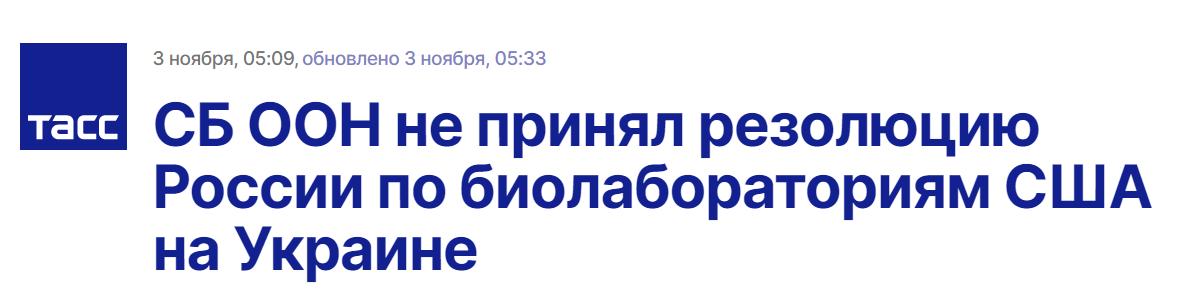 據塔斯社報道,根據俄方提出的決議草案,聯合國安理會15個理事國應成立一個委員會,針對烏境內生物實驗室開展的活動,調查美國和烏克蘭是否遵守《禁止生物武器公約》規定的義務。該委員會應在11月30日前向安理會提交調查報告,並在日內瓦於11月28日至12月16日期間舉行的《禁止生物武器公約》第九次審議大會上報告調查結果。