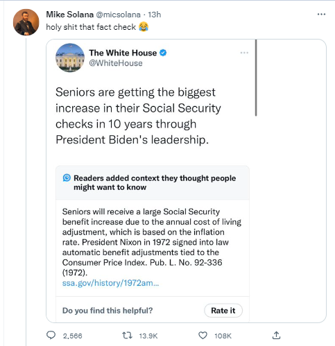 當地時間11月1日,白宮在其官方推特平台上發文寫道:“在拜登總統的領導下,老年人的社會保障金正在獲得10年來最大的增長。”一名用户認為這一説法缺乏依據,並使用推特的“社區筆記”功能增加註釋信息,稱這種增長是由於通貨膨脹導致,還鏈接到美國社會保障局網站的法律歷史頁面加以佐證。隨後,越來越多網友對白宮的這條推文進行批評。