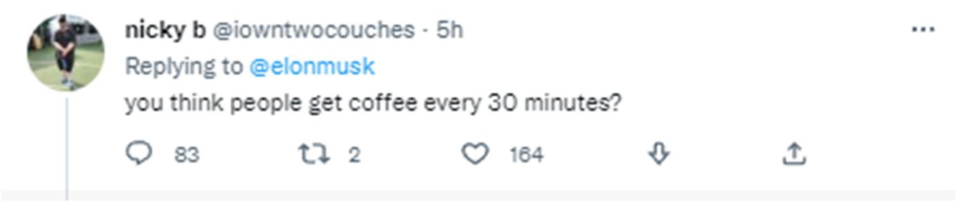 有人質問馬斯克:“你認為人們每30分鐘都要喝一杯星巴克嗎?”↓