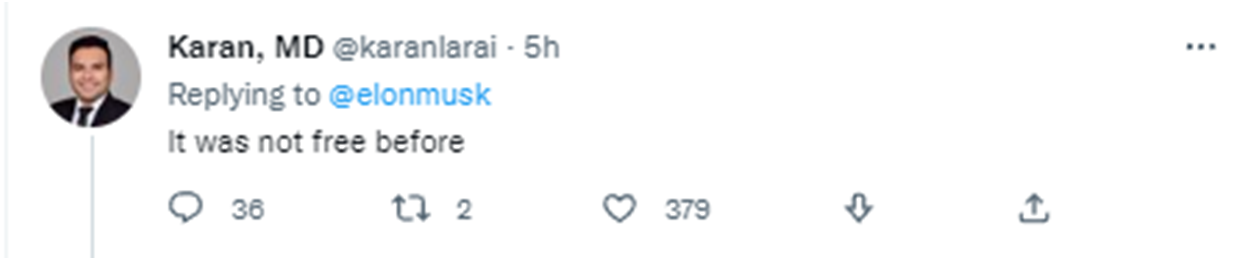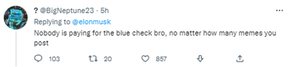 在馬斯克該推文下方,不少網友似乎並不認同他的這番對比,表達自己不會為推特認證進行付費的想法。