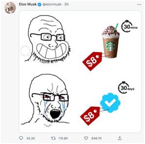 馬斯克當天所發的發圖,上方是一男子看着右邊標價為8美元的星巴克飲品,喜笑顏開,旁邊圖標寫着:“(能喝)30分鐘”;圖片下方是一名男子看着的是右邊同樣標價為8美元的推特藍色認證標記,痛哭流涕,旁邊圖標寫着:“(能用)30天。”↓
