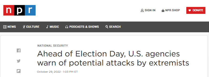 另據美國國家公共廣播電台(NPR)消息,他們獲得的由美國國土安全部、聯邦調查局、美國國家反恐中心和美國國會警察發佈的公告顯示,單獨行動對潛在目標構成的威脅最大。美國國內暴力極端主義的增加助長了暴力的風險,這些事件反映出,在距離中期選舉不到兩週的時間裏,美國的政治氣候愈發危險。