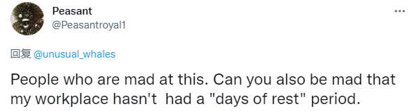 還有人説:“對這件事很生氣的人,你們能不能也對我的公司沒有‘休息日’生生氣?”