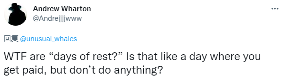 另一方面,也有一些人對推特公司此前實行的所謂“休息日”發表意見。有人評論稱:“‘休息日’是什麼鬼?就是你什麼也不幹就能拿薪酬的日子嗎?”