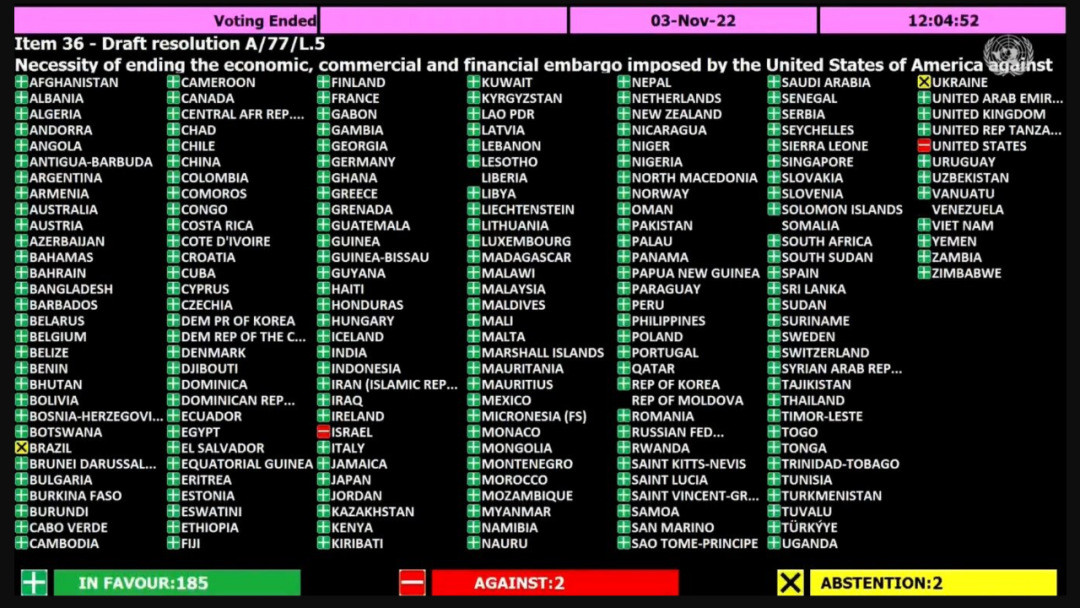 當地時間11月3日,在美國紐約聯合國總部進行的第77屆聯合國大會上,全世界幾乎所有國家,通過投票的方式,再次對美國持續對主權國家古巴進行的經濟封鎖政策表達了強烈不滿。