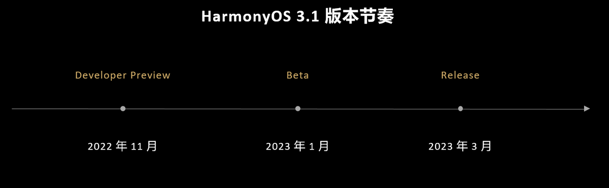 開發者在HDC2022期間可以體驗到HarmonyOS 3.1 Developer Preview版本,華為預計2023年1月發佈HarmonyOS 3.1 Beta版本,2023年3月發佈HarmonyOS 3.1 Release版本。