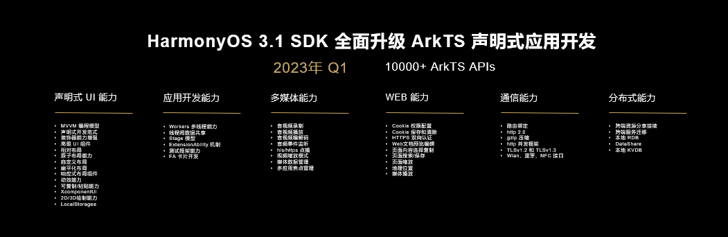 會上,華為還發布了可體驗鴻蒙開發套件的HarmonyOS 3.1版本,HarmonyOS 3.1 SDK將全面升級ArkTS聲明式應用開發。預計到2023年第一季度,將支持1萬+ ArkTS APIs,擁有聲明式UI、應用開發框架、分佈式系統服務、多媒體、WEB、通信等多種能力,可支持ArkTS商用應用開發。同時華為HarmonyOS從3.0版本就兼容OpenHarmony API能力,本次發佈的3.1版本兼容OpenHarmony的API 9。未來HarmonyOS將繼續基於OpenHarmony演進,華為也將持續投入OpenHarmony開源項目共建。