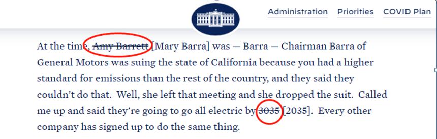 根據白宮官網發佈的實錄顯示,拜登當天在一段話中先是喊錯通用汽車董事長的名字:“艾米·巴雷特…呃…巴拉是通用汽車的董事長,她起訴加州。”隨後拜登又説道,“她給我打電話説,通用將於3035年前實現全電動車。”